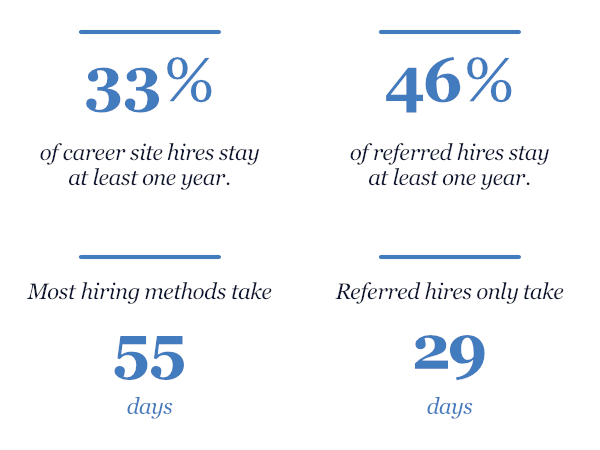 Happy employees refer their friends to work at your company. LinkedIn’s recruiting research found that employee referrals have the highest return on investment compared to all other recruiting methods. Referred employees are cheaper to hire than traditional hires, are hired faster, and stay with the company for longer. Not only that, but strong performers tend to refer other strong performers.(7)